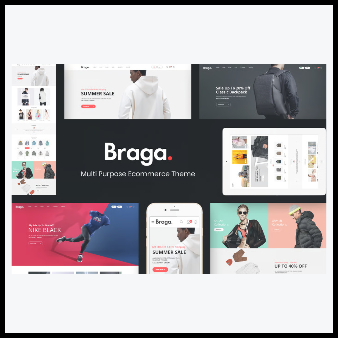 تم تطوير Braga Fashion Theme ليتناسب مع متاجر الملابس، والإكسسوارات، والأحذية، والعطور، وغيرها من منتجات الموضة التي تتطلب عرضًا بصريًا جذابًا يعكس هوية العلامة التجارية. يعتمد القالب على تصميم منسق بدقة يركّز على إبراز الصور بجودة عالية، مع توزيع متوازن للعناصر داخل الصفحات يسهّل التصفح ويمنح تجربة مستخدم مريحة سواء على الهواتف المحمولة أو الحواسيب المكتبية.
