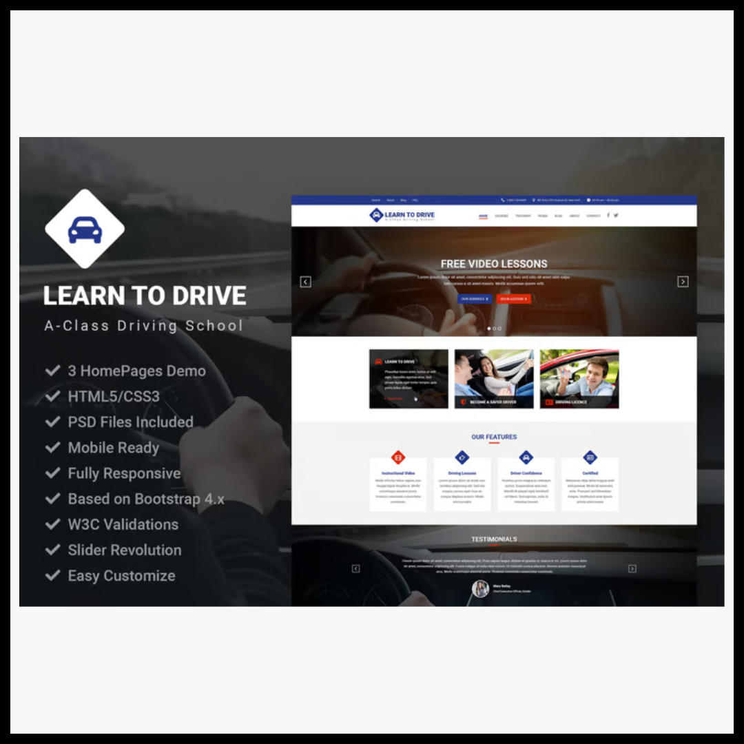 يُعَد elements driving school منتجًا رقميًا احترافيًا تم تصميمه بعناية ليكون الحل المثالي لإنشاء موقع إلكتروني خاص بمدارس تعليم القيادة، أو مراكز التدريب على السيارات، أو حتى المدربين المستقلين الراغبين في عرض خدماتهم بطريقة احترافية وجذابة. يتميز القالب بتصميمه العصري الذي يجمع بين التنظيم البصري والدقة في عرض المحتوى، مما يساعد على بناء الثقة مع الزوار ويُبرز هوية المشروع التعليمية بأسلوب راقٍ وواضح.