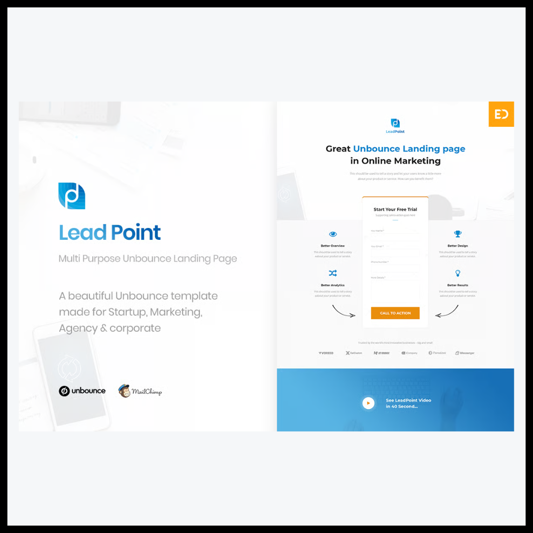 يُعد Elements Leadpoint – Lead Generation Unbounce Landing منتجًا رقميًا متكاملًا صُمم بعناية ليمنحك تجربة استثنائية في إنشاء صفحات هبوط احترافية عالية الأداء عبر منصة Unbounce. هذا القالب يمثل الخيار المثالي لكل من يسعى إلى تطوير حضور رقمي قوي وجذاب يجمع بين التصميم العصري والهيكل التسويقي الفعّال، مما يجعله أداة مميزة لأي مشروع أو حملة تسويقية تهدف إلى جذب العملاء المحتملين وتعزيز العلامة التجارية.