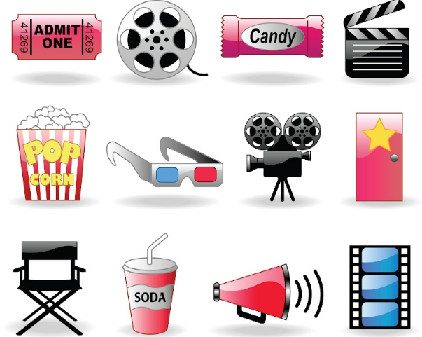 أيقونات متنوعة مستوحاة من عالم السينما (كاميرات، شاشات، بكرات أفلام، تذاكر، مشاهد تصوير والمزيد).